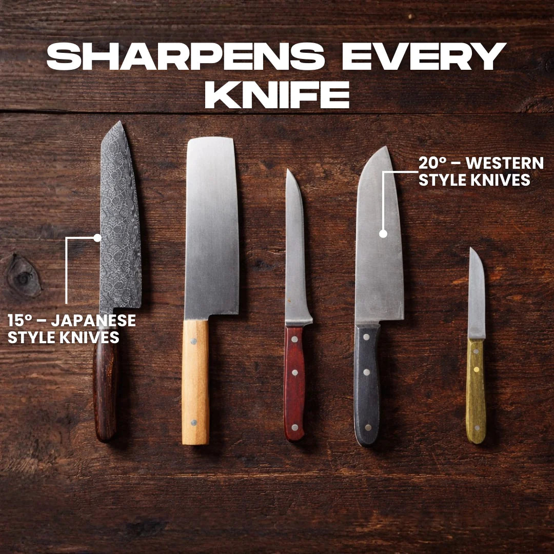 Whether you're a novice or an expert, our sharpener guarantees a perfect edge with every use. Just select your preferred angle and slide the blade along the rolling disc. It's effortless and straightforward, ensuring razor-sharp knives every time.