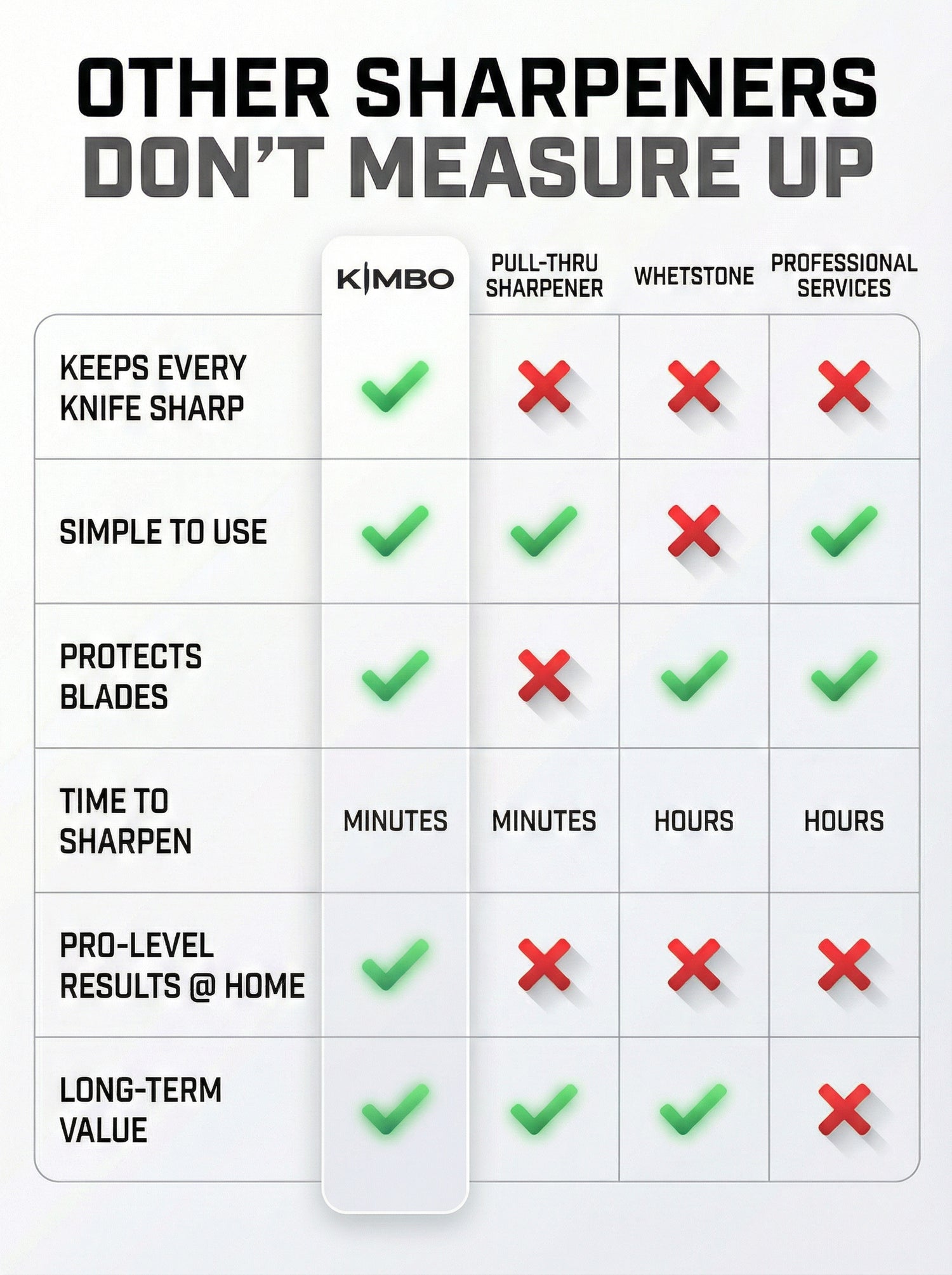 People choose Kimbo for its ease of use, consistent, long-lasting sharpness, and convenient at-home sharpening.